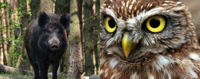 Op de foto-optische illusie zie je bomen, wilde zwijnen en ergens is er een vogel, die je heel snel moet vinden. Alleen mensen met een krachtige intelligentie kunnen de uil in 9 seconden vinden.
