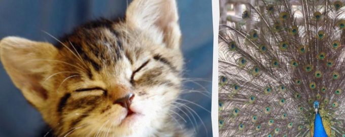 Het katje zat achter de staart van de pauw / collage met Moje foto