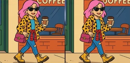 In beide afbeeldingen zien we een meisje met roze haar over straat lopen met een koffie in haar hand.