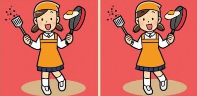 Beide tekeningen tonen een meisje dat roerei maakt. En ze lijkt in de problemen te zitten, want het gebakken ei staat op het punt om uit de koekenpan op de grond te vallen.