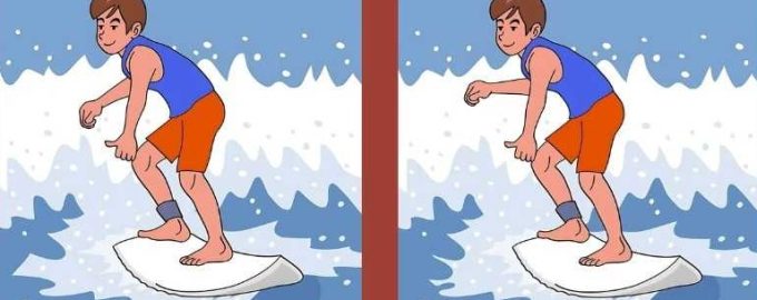 Op de foto zien we een surfer die de golven bedwingt op een surfplank. Op het eerste gezicht lijkt het misschien alsof de jongens op beide foto’s hetzelfde zijn, maar als je goed kijkt, wordt duidelijk dat dat niet zo is – ergens zijn er een paar verschillen die de foto’s verschillend maken.