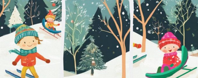 Voor je zie je een groep blije kinderen die genieten van de sneeuw en het echte winterweer in het bos. De kleintjes zijn aan het sleeën en hun oudere vrienden zijn aan het skiën.