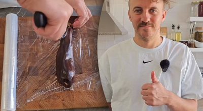 Yevhen Klopotenko, een bekende kok in Oekraïne, vertelde ons over twee manieren om het vruchtvlees uit een aubergine te halen.