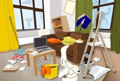 Kijk eens naar de foto hierboven. Het laat een woonkamer zien die een algehele schoonmaakbeurt nodig heeft. Er liggen kleren op de vloer en op het meubilair, kussens van de bank zijn van hun plaats geslagen en er hangen schilderijen aan de muur. Er staat ook een trapladder, een emmer en rubberen handschoenen in het midden van de kamer, wat suggereert dat de huiseigenaren bezig zijn met de algemene schoonmaak.